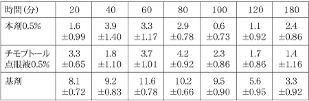 ウサギの水負荷高眼圧モデルに対する眼圧上昇抑制作用について、本剤0.5%及びチモプトール点眼液0.5%をそれぞれ薬剤点眼1時間前(水負荷30分前に薬剤点眼)、水負荷後20、40、60、80、100、120及び180分後に眼圧を測定した。得られた結果について統計解析を行った結果、両製剤の生物学的同等性が確認された15)。