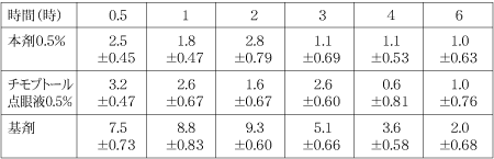 ウサギのα-キモトリプシン惹起高眼圧モデルに対する眼圧下降作用について、本剤0.5%及びチモプトール点眼液0.5%を1日2回1週間点眼投与し、1日3回(午前9時、11時及び午後4時)眼圧を測定した。得られた結果について統計解析を行った結果、両製剤の生物学的同等性が確認された15)。