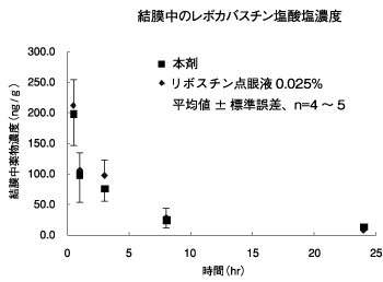 日本白色家兎に本剤あるいはリボスチン点眼液0.025%を点眼後0.5、1、3、8及び24時間に眼瞼結膜を摘出し結膜中薬物濃度を測定した。結膜中の薬物濃度は、本剤の点眼0.5時間後に最高値(199.19ng/g)を示した後、一次速度式に従って徐々に消失した。本剤とリボスチン点眼液0.025%の値を用いてStudentのt検定にて統計解析を行った結果、いずれの測定点においても両剤の間に有意な差は認められず、両剤の生物学的同等性が確認された5)。