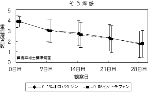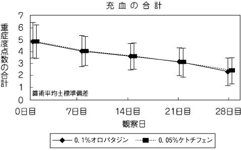 アレルギー性結膜炎患者(247例)を対象に、0.1%オロパタジン塩酸塩点眼液又は0.05%ケトチフェンフマル酸塩点眼液を両眼に1回2滴、1日4回(朝、昼、夕、就寝前)28日間点眼投与したところ、そう痒感及び充血の重症度点数において、0.1%オロパタジン塩酸塩点眼液は0.05%ケトチフェンフマル酸塩点眼液に劣らない有効性を示した。