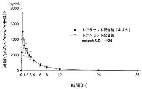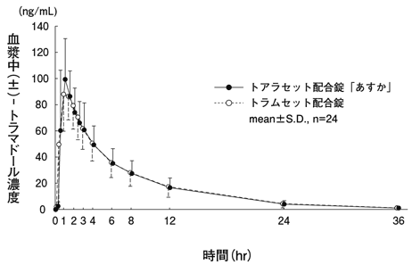 トアラセット配合錠「あすか」とトラムセット配合錠を、クロスオーバー法によりそれぞれ1錠(トラマドール塩酸塩37.5mg及びアセトアミノフェン325mg)健康成人男性に絶食単回経口投与して血漿中濃度を測定し、得られた薬物動態パラメータ(AUC、Cmax)について90%信頼区間法にて統計解析を行った結果、log(0.80)~log(1.25)の範囲内であり、両剤の生物学的同等性が確認された2)。