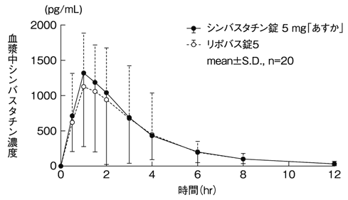 健康成人男性にシンバスタチン錠5mg「あすか」とリポバス錠5それぞれ1錠(シンバスタチンとして5mg)をクロスオーバー法により絶食単回経口投与して血漿中濃度を測定し、得られた薬物動態パラメータ(AUC、Cmax)について90%信頼区間法にて統計解析を行った結果、log(0.80)~log(1.25)の範囲内であり、両剤の生物学的同等性が確認された4)。