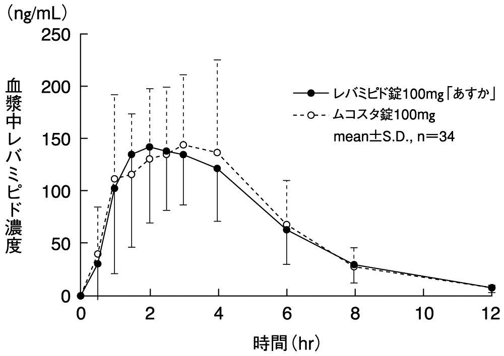 健康成人男性にレバミピド錠100mg「あすか」とムコスタ錠100mgそれぞれ1錠(レバミピドとして100mg)をクロスオーバー法により絶食単回経口投与して血漿中レバミピド濃度を測定し、得られた薬物動態パラメータ(AUC、Cmax)について90%信頼区間法にて統計解析を行った結果、log(0.80)~log(1.25)の範囲内であり、両剤の生物学的同等性が確認された2) 。