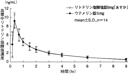 健常成人女性にリトドリン塩酸塩錠5mg「あすか」とウテメリン錠5mgそれぞれ2錠(リトドリン塩酸塩として10mg)を、クロスオーバー法により絶食単回経口投与して血漿中未変化体濃度を測定し、得られた薬物動態パラメータ(AUC、Cmax)について統計解析を行った結果、両剤の生物学的同等性が確認された2) 。