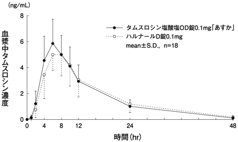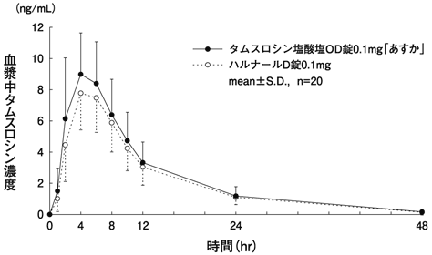 健康成人男性にタムスロシン塩酸塩OD錠0.1mg「あすか」とハルナールD錠0.1mgそれぞれ2錠(タムスロシン塩酸塩として0.2mg)をクロスオーバー法により絶食単回経口投与及び食後単回経口投与して血漿中タムスロシン濃度を測定し、得られた薬物動態パラメータ(AUC、Cmax)について90%信頼区間法にて統計解析を行った結果、log(0.80)~log(1.25)の範囲内であり、両剤の生物学的同等性が確認された6)。