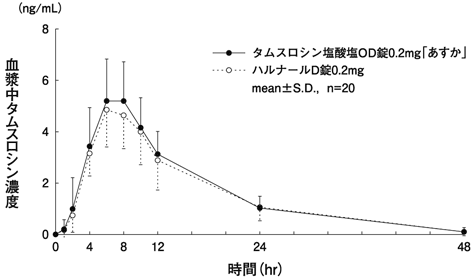 健康成人男性にタムスロシン塩酸塩OD錠0.2mg「あすか」とハルナールD錠0.2mgそれぞれ1錠(タムスロシン塩酸塩として0.2mg)をクロスオーバー法により絶食単回経口投与及び食後単回経口投与して血漿中タムスロシン濃度を測定し、得られた薬物動態パラメータ(AUC、Cmax)について90%信頼区間法にて統計解析を行った結果、log(0.80)~log(1.25)の範囲内であり、両剤の生物学的同等性が確認された6)。