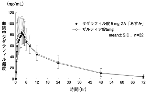 日本人健康成人36例にタダラフィル5、10、20、40mg注1)を単回経口投与したときのタダラフィルの血漿中濃度は、投与0.5~4時間(Tmaxの中央値、3時間)の間にピークに達した後、消失した。消失半減期は約14~15時間であった17)。注1)最大承認用量は5mgである。