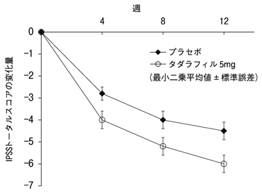 第Ⅱ相試験を完了した394例の被験者が42週の長期投与非盲検試験に参加した。前立腺肥大症に伴う排尿障害患者にタダラフィル5mgを1日1回54週間(二重盲検期間12週を含む)長期継続投与した結果、IPSSトータルスコアの継続的な改善の維持が認められ、長期の安全性及び良好な忍容性が確認された40)。副作用発現頻度は、タダラフィル5mg群で10.7%(42/394例)であった。主な副作用は、消化不良及び胃食道逆流性疾患が各1.3%(5/394例)であった。