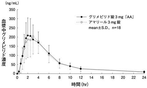 健康成人男性にグリメピリド錠3mg「AA」とアマリール3mg錠それぞれ1錠(グリメピリドとして3mg)をクロスオーバー法により絶食単回経口投与して血漿中未変化体濃度を測定し、得られた薬物動態パラメータ(AUC、Cmax)について90%信頼区間法にて統計解析を行った結果、log(0.80)~log(1.25)の範囲内であり、両剤の生物学的同等性が確認された3)。