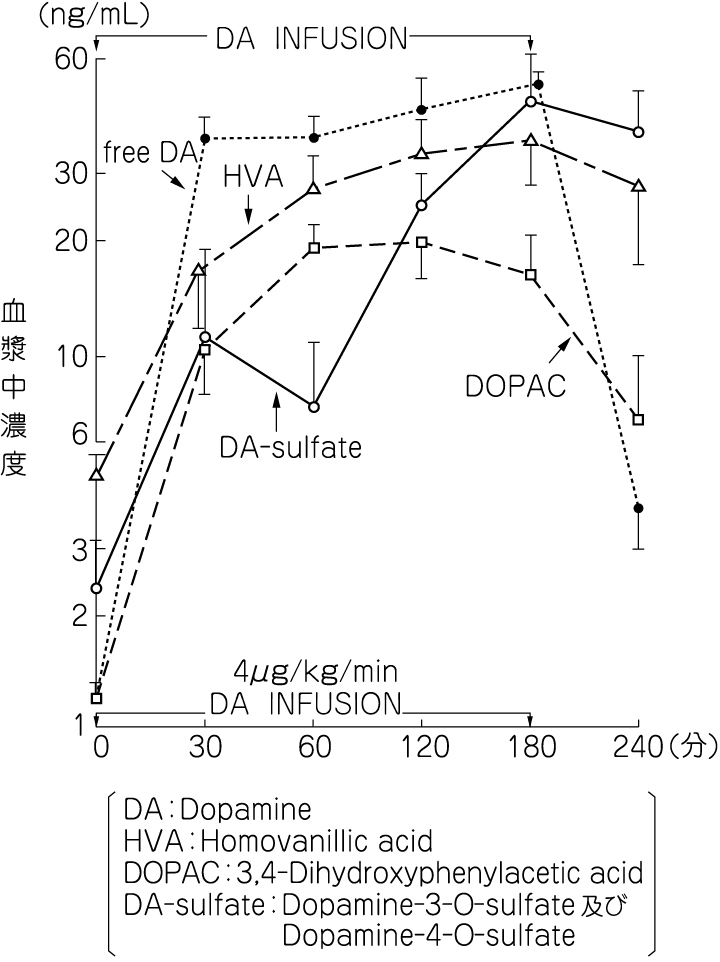 外国人健康成人8例にドパミン塩酸塩4μg/kg/minを180分間点滴静注したときの遊離ドパミン及びその代謝物の血漿中濃度推移は以下のとおりであった1)。