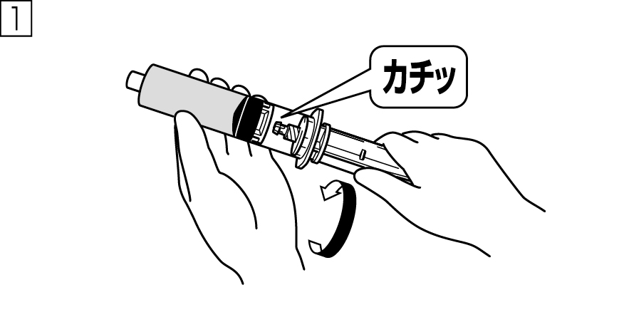押子をまっすぐ挿入し、押子接続用部品に軽く突き当てた後、押子を時計回りに回し、しっかりと接続すること(カチッという音がしたら、それ以上押子を回転させないこと)。[押子の接続が適切でない場合、“サイフォニング(自然落下による急速注入)”や“逆流”が起こるおそれがある。また、ガスケットが歪んだり、ガスケットと押子接続用部品の間に隙間があると、エアー混入、液漏れやシリンジポンプの残量警報が発報しないおそれがある。]