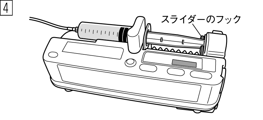 シリンジポンプの取扱説明書に従い、スライダーのフックに確実にセットし、投与する。[正しくセットされていない場合、“サイフォニング”や“逆流”が起こるおそれがある。]