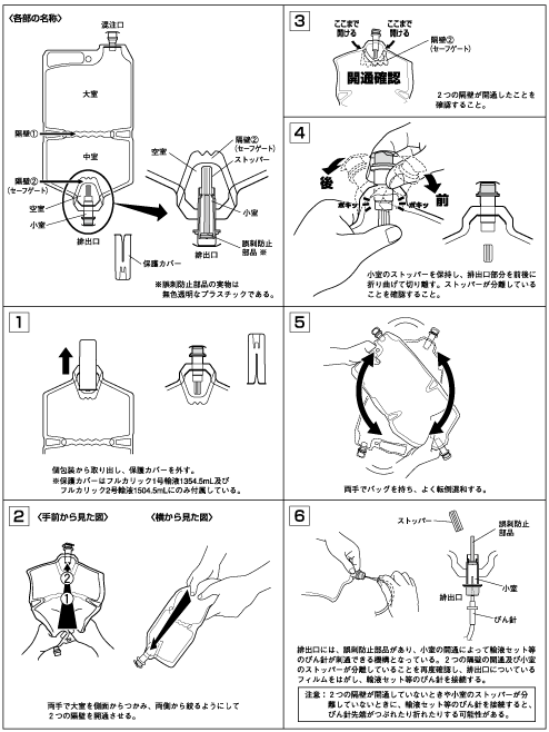 本剤は経中心静脈栄養療法の維持液として用いる。通常、成人には1日2006mLを24時間かけて中心静脈内に持続点滴注入する。なお、年齢、症状、体重により適宜増減する。