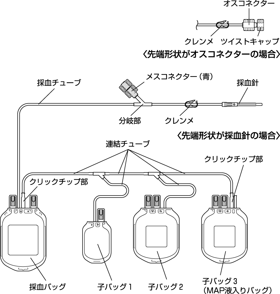 外気がバッグ内に入ることを防ぐために分岐部とオスコネクター間のクレンメを閉じてから、オスコネクター部をねじって切断・開放し、翼付静注針等を接続し、針プロテクターを外す。(接続部にゆるみが無いことを確認する。)翼付静注針等を静脈に穿刺し、血液がチューブ内に入るのを確認したら、分岐部とオスコネクター間のクレンメを開く。(すでに翼付静注針等で静脈を確保されている場合には、チューブ先端のオスコネクターを翼付静注針等に接続し、接続不十分等による漏れがないことを確認してから、分岐部とオスコネクター間のクレンメを開放し採血を開始する。)
