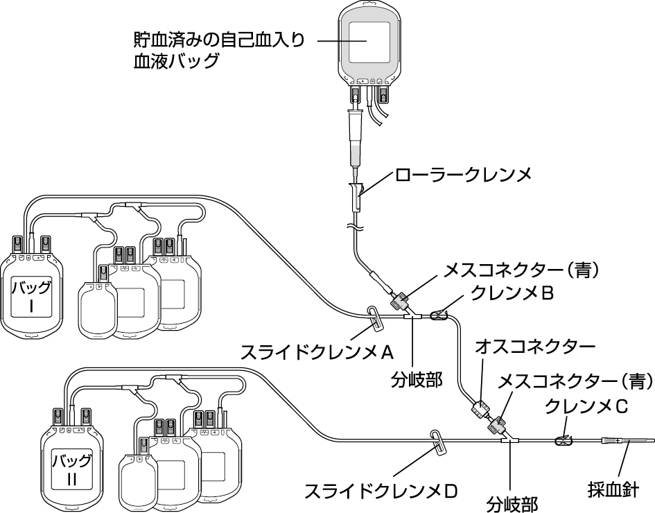 3)バッグⅡの分岐部と採血針間のクレンメ〔図のクレンメC〕