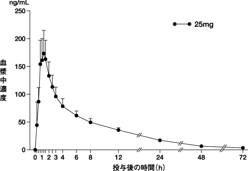 健康成人(8例)にアログリプチンとして25mgを単回経口投与した時の血漿中濃度推移及び薬物動態学的パラメータは以下のとおりである1)。