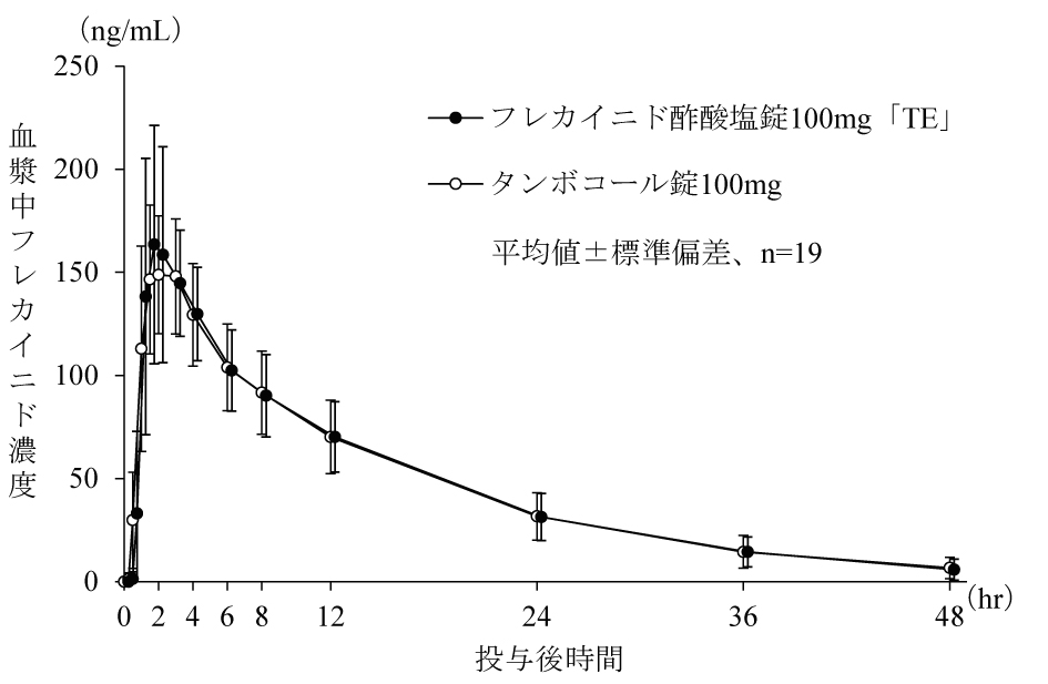 健康成人男子12例にフレカイニド酢酸塩50mg、100mgを単回経口投与した場合、消化管からの吸収は良好であり、血漿中濃度は投与後2~3時間で最高値に達し、半減期約11時間で消失する。血漿中濃度はほぼ投与量公比に比例して上昇する。不整脈患者においてもほぼ同様の薬物動態を示す。また、健康成人男子10例にフレカイニド酢酸塩50mg、100mgを1日2回食後に7日間反復投与した際、血漿中濃度は投与後4日目でほぼ定常状態に達し、その血漿中濃度は初回投与時の約2倍を示す2),3)。