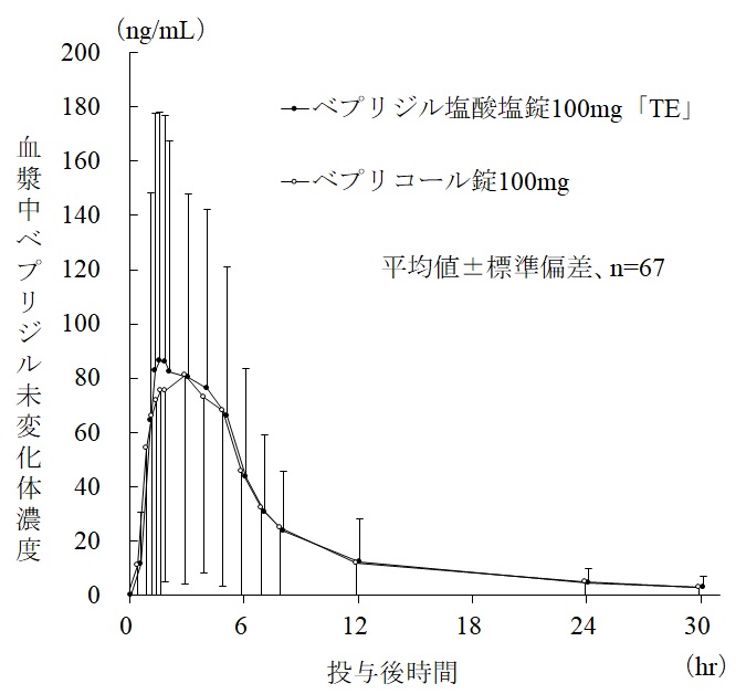 ベプリジル塩酸塩錠100㎎「TE」とベプリコール錠100mgを、クロスオーバー法によりそれぞれ1錠(ベプリジル塩酸塩水和物として100㎎)健康成人男子に絶食時単回経口投与して血漿中未変化体濃度を測定した。薬物動態パラメータ(AUC、Cmax)について統計解析を行った結果、対数値の平均値の差の90%信頼区間がlog(0.80)~log(1.25)の範囲内であり、かつ対数値の平均値の差がlog(0.90)~log(1.11)の範囲内であることから、両剤の生物学的同等性が確認された2)。