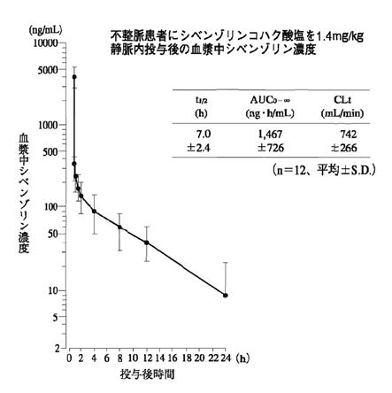 不整脈患者(12例)にシベンゾリンコハク酸塩1.4mg/kgを静脈内投与した場合、血漿中濃度は見掛け上3相性で消失し、最終相の消失半減期は7.0時間であった2)。基礎疾患として急性心筋梗塞を有する不整脈患者(7例)と有さない不整脈患者(4例)に、シベンゾリンコハク酸塩1.4mg/kgを静脈内投与し、その体内動態を比較したところ、血漿中濃度は両群ともほぼ同様の推移を示し、急性心筋梗塞の有無に影響されなかった3)。