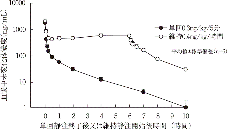 健康成人男子(6例)に本剤0.4mg/kg/時間を維持静注した場合、血漿中未変化体濃度は投与開始後約4時間で定常状態に達し、投与終了後は単回静注時と同様に二相性に消失した2)。,,
