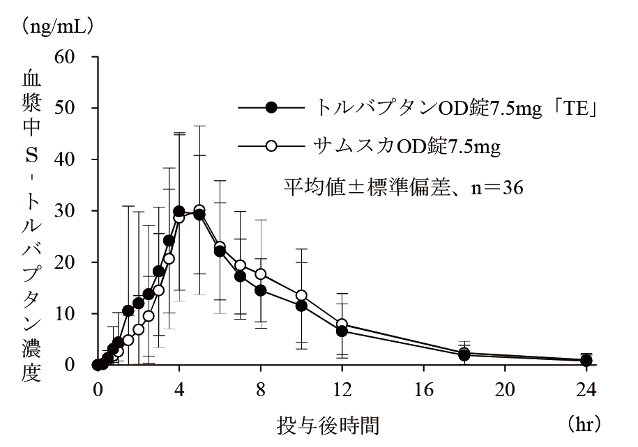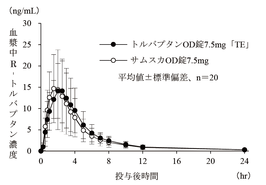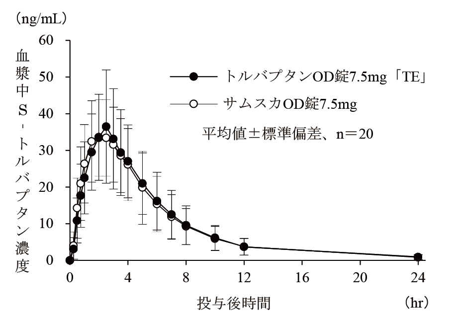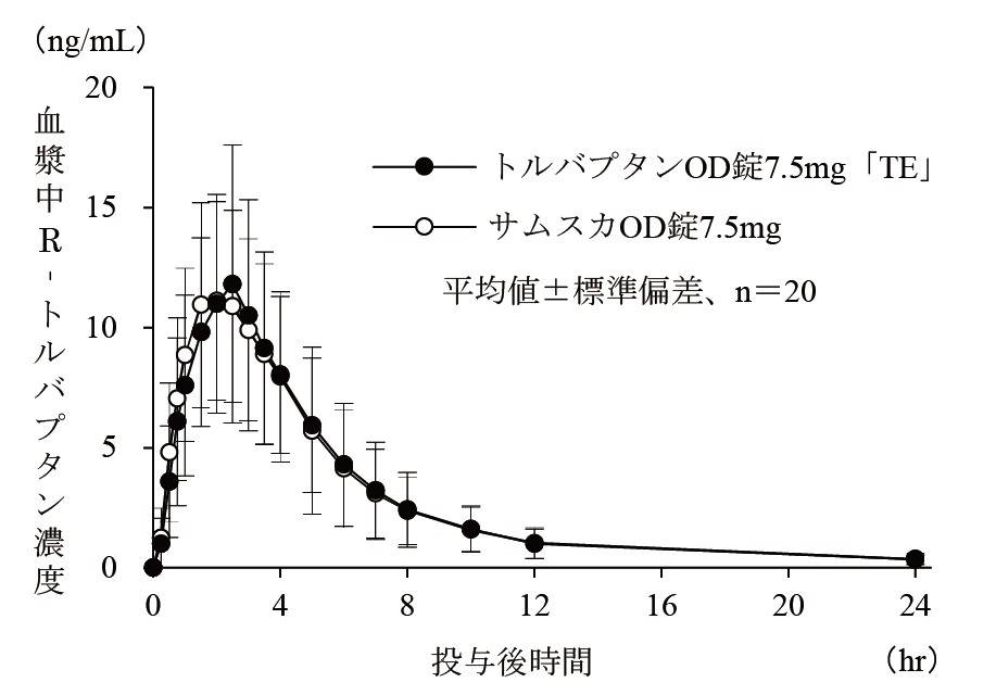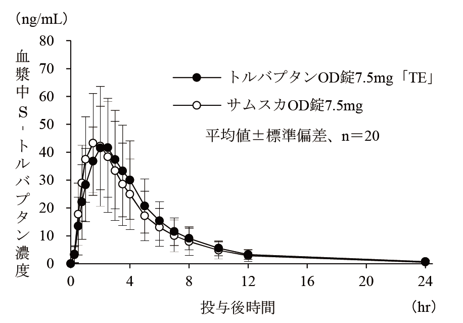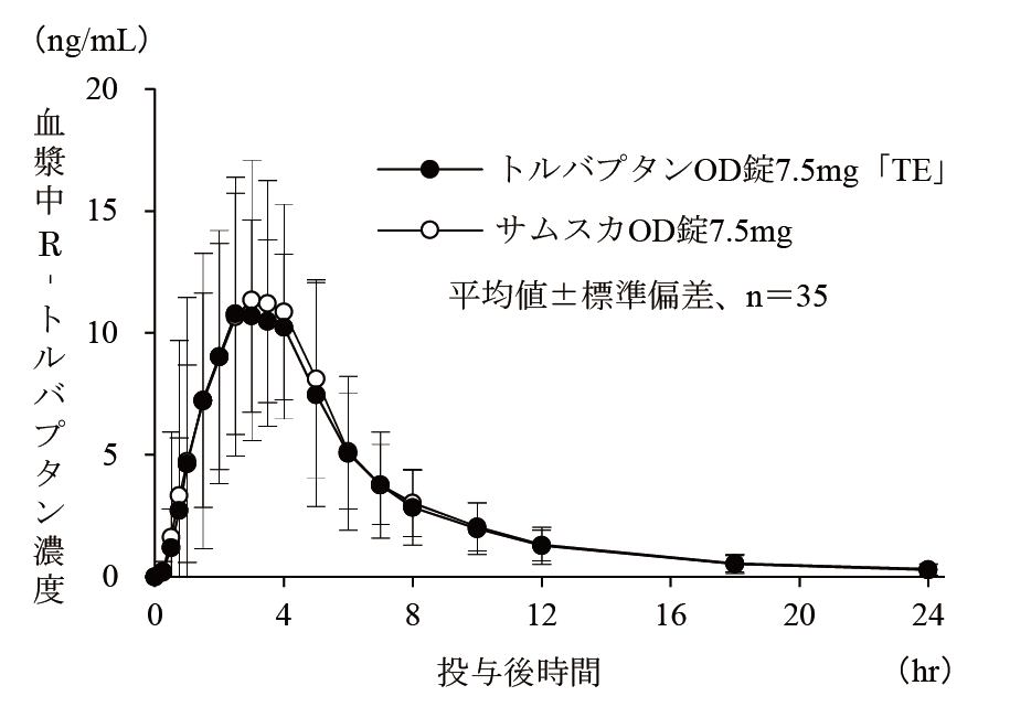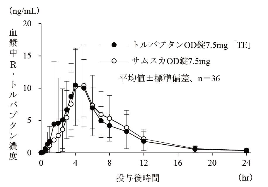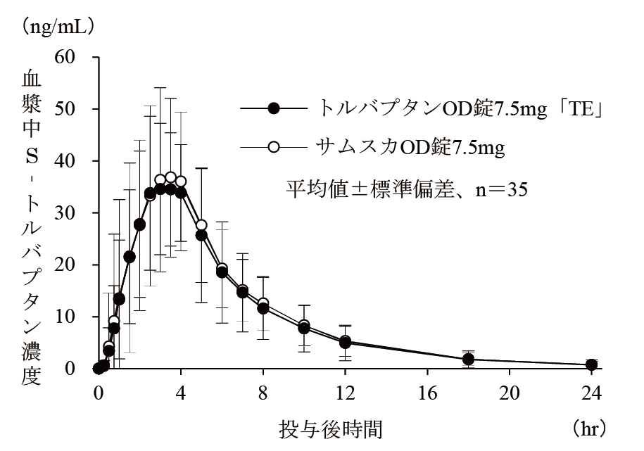 トルバプタンOD錠3.75mg「TE」は、トルバプタンOD錠7.5mg「TE」を標準製剤としたとき、溶出挙動が同等と判断され、生物学的に同等とみなされた23)。