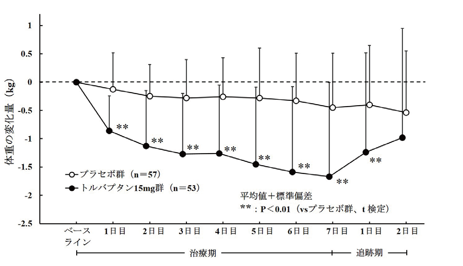 他の利尿薬を投与しても体液貯留が認められるうっ血性心不全患者を対象とした二重盲検比較試験において、トルバプタン15mg又はプラセボを1日1回7日間経口投与した。主要評価項目である最終投与時の体重変化量は、トルバプタン15mg群-1.54±1.61kg(ベースライン:59.42±12.30kg、53例)(平均値±標準偏差、以下同様)、プラセボ群-0.45±0.93kg(ベースライン:55.68±12.60kg、57例)であり、トルバプタン群では、プラセボ群に比較して有意な体重減少が認められた(p<0.0001、t検定)。体重減少は投与翌日よりみられ投与期間を通じて継続した(図17-1)。また、最終投与時における心性浮腫に伴う所見(頚静脈怒張、肝腫大、下肢浮腫)が改善した(表17-1)。