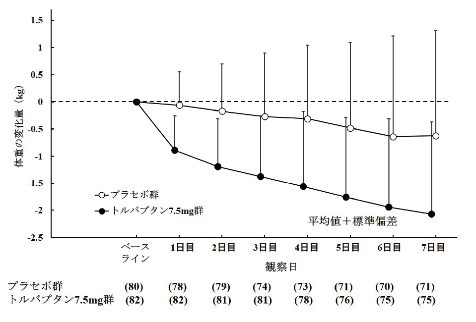 他の利尿薬を投与しても体液貯留が認められる肝硬変患者を対象とした二重盲検比較試験において、トルバプタン7.5mg又はプラセボを1日1回7日間経口投与した。主要評価項目である最終投与時の体重変化量は、トルバプタン7.5mg群-1.95±1.77kg(ベースライン:59.35±12.69kg、82例)(平均値±標準偏差、以下同様)、プラセボ群-0.44±1.93kg(ベースライン:59.15±13.15kg、80例)であり、トルバプタン群では、プラセボ群に比較して有意な体重減少が認められた(p<0.0001、t検定)。体重減少は投与翌日よりみられ投与期間を通じて継続した(図17-2)。最終投与時における肝性浮腫に伴う所見(腹水量、腹囲、下肢浮腫)が改善した(表17-2)。また、臨床症状(腹部膨満感、倦怠感、臥位での圧迫感、呼吸困難感、全身状態)も改善した。