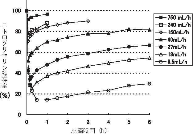 点滴速度によるニトログリセリン残存率への影響