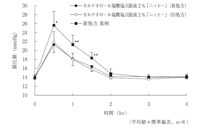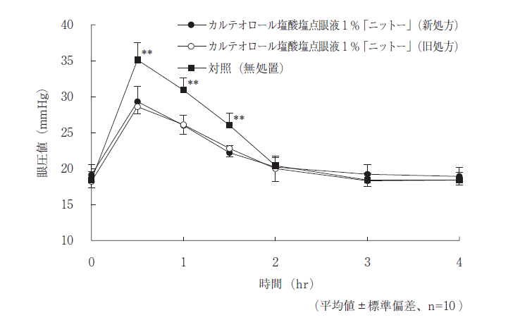 ウサギ水負荷眼圧上昇モデルに対して、カルテオロール塩酸塩点眼液1%「ニットー」(新処方)又はカルテオロール塩酸塩点眼液1%「ニットー」(旧処方)を水負荷5分前に100μL点眼し、点眼前、水負荷後0.5、1、1.5、2、3及び4時間に眼圧を測定し、眼圧上昇抑制作用を調べた。その結果、両剤ともに水負荷後0.5、1及び1.5時間においてControl(無処置)群に対して有意な差が認められ、両剤間では有意な差が認められず、両剤の生物学的同等性が確認された 12) 。