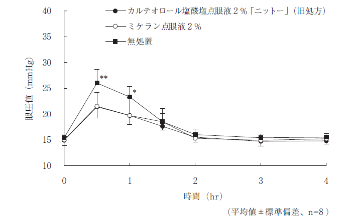 ウサギ水負荷眼圧上昇モデルに対して、カルテオロール塩酸塩点眼液1%「ニットー」(旧処方)又はミケラン点眼液1%を水負荷5分前に100μL点眼し、点眼前、水負荷後0.5、1、1.5、2、3及び4時間に眼圧を測定し、眼圧上昇抑制作用を調べた。その結果、カルテオロール塩酸塩点眼液1%「ニットー」(旧処方)は水負荷後0.5及び1時間においてControl(無処置)群に対して有意な差が認められ、両剤間では有意な差が認められず、両剤の生物学的同等性が確認された12) 。