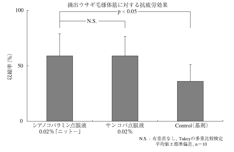調節性眼精疲労患者45例を対象に、0.02%シアノコバラミン点眼液又はプラセボ点眼液を1回1~2滴、1日4回両眼に2週間点眼した結果、0.02%シアノコバラミン点眼液はプラセボ点眼液と比較し、特に微動調節測定法において顕著な有意差が認められ(総合判定における改善率:0.02%シアノコバラミン点眼液群80.4%、プラセボ群13.6%)、有用性判定においても有意に優れている(0.02%シアノコバラミン点眼液群91.3%、プラセボ群22.7%)ことが確認された。副作用は認められなかった2) 。