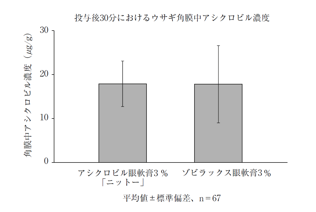 アシクロビル眼軟膏3%「ニットー」とゾビラックス眼軟膏3%をそれぞれウサギに片眼ずつ投与し、30分後の角膜中アシクロビル未変化体濃度について90%信頼区間法にて統計解析を行った結果、log(0.80)~log(1.25)の範囲内であり、両剤の生物学的同等性が確認された4) 。