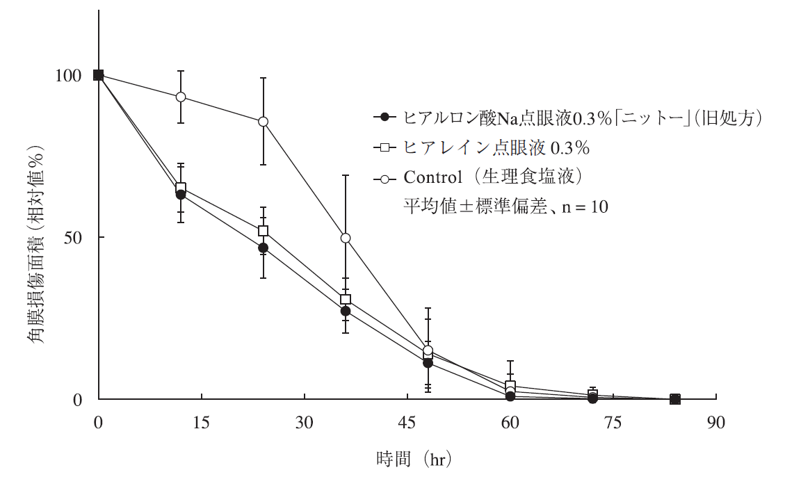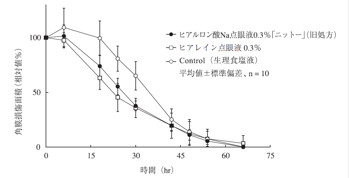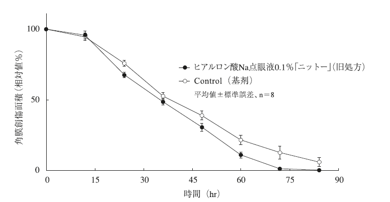 代替角膜(ソフトコンタクトレンズ)に試験製剤[ヒアルロン酸Na点眼液0.1%「ニットー」(新処方)]あるいは標準製剤[ヒアルロン酸Na点眼液0.1%「ニットー」(旧処方)]を反復滴下して初回滴下後3時間における残存率(相対湿重量)を算出した結果、両製剤の生物学的同等性が確認された7)。