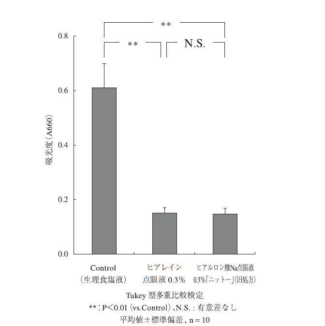 ドライアイ等に伴う角結膜上皮障害患者115例を対象に、人工涙液を少なくとも1週間点眼後、0.1%ヒアルロン酸ナトリウム点眼液又はグルタチオン点眼液を1日5回、両眼に4週間点眼した結果、0.1%ヒアルロン酸ナトリウム点眼液群の改善率は71.4%(40/56例)であり、グルタチオン点眼液群の31.5%(17/54例)と比較し、有意な改善が認められた。副作用は0.1%ヒアルロン酸ナトリウム点眼液群の55例中1例(1.8%)に認められ、しみる1例のみであった1) 。