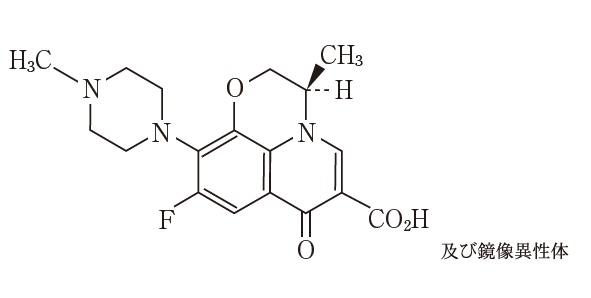 オフロキサシンは帯微黄白色〜淡黄白色の結晶又は結晶性の粉末である。酢酸(100)に溶けやすく、水に溶けにくく、アセトニトリル又はエタノール(99.5)に極めて溶けにくい。水酸化ナトリウム試液溶液(1→20)は旋光性を示さない。光によって変色する。融点:約265℃(分解)