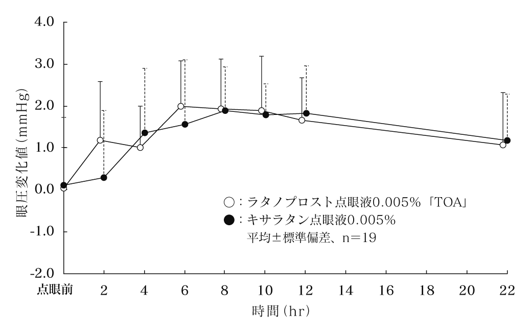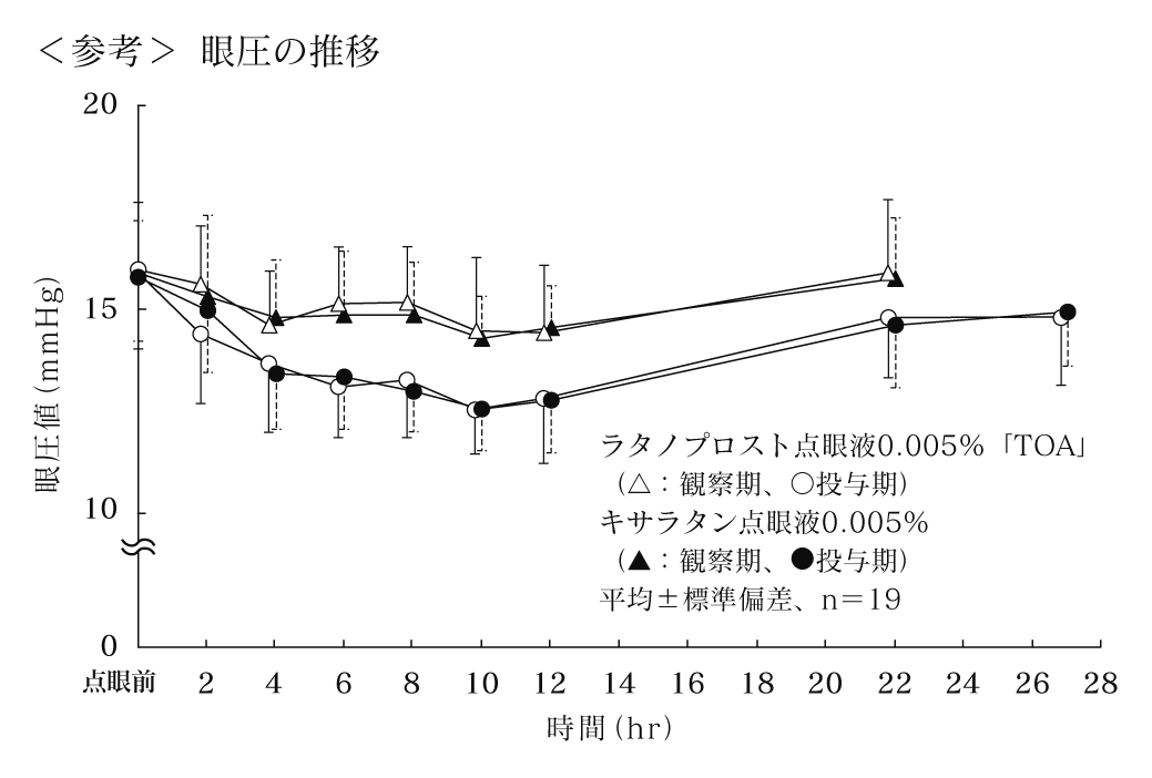 ラタノプロスト点眼液0.005%「TOA」とキサラタン点眼液0.005%を、健康成人男子を対象に、クロスオーバー法によりそれぞれ1滴、両眼の結膜嚢内に単回点眼して眼圧を測定し、得られたパラメータ(点眼前後における最大眼圧差、眼圧変化値-時間曲線下面積)について統計解析を行った結果、両剤の生物学的同等性が確認された6) 。
