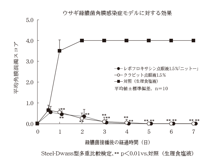 レボフロキサシン点眼液1.5%「ニットー」とクラビット点眼液1.5%について、ウサギ緑膿菌角膜感染症モデルに対する治療効果の比較を行った。その結果、両剤ともに対照(生理食塩液)に対して有意に治療効果を示し、両剤の治療効果に有意な差は認められず、両剤の生物学的同等性が確認された3) 。