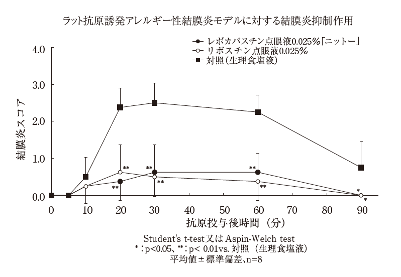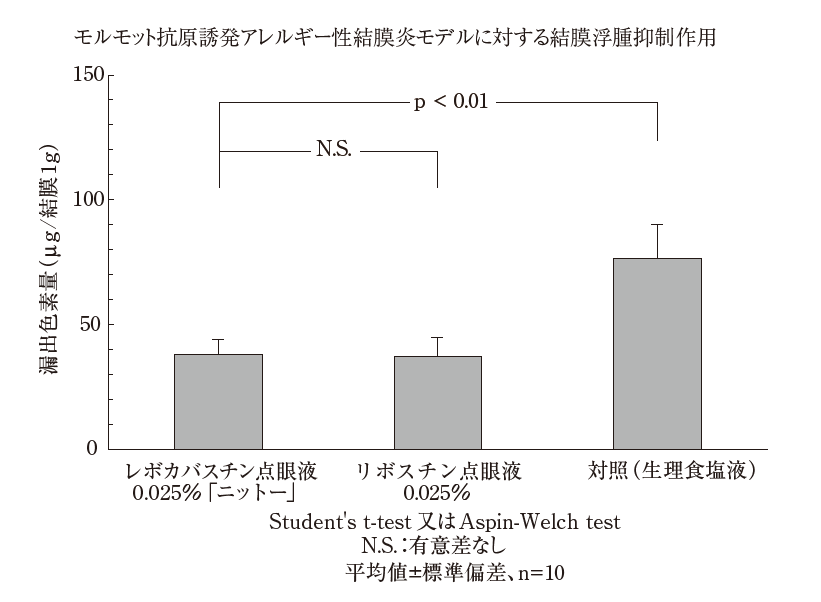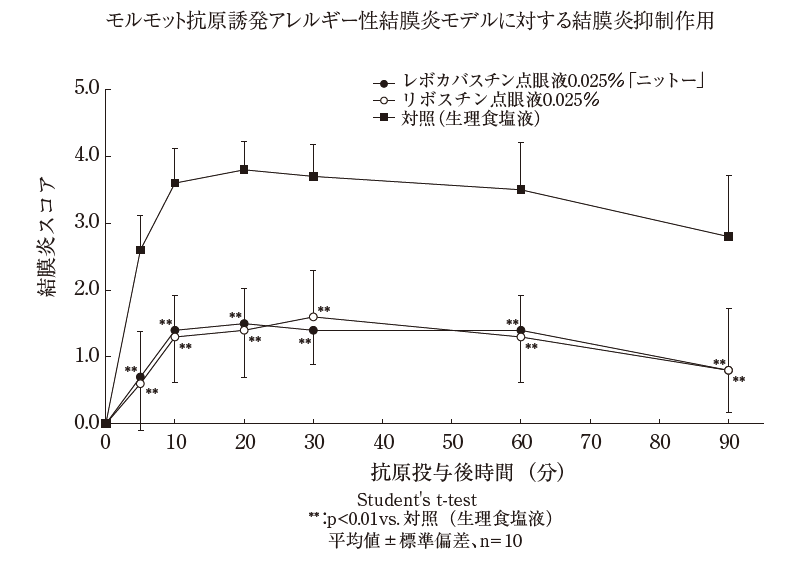 モルモット抗原誘発アレルギー性結膜炎モデルに対して、レボカバスチン点眼液0.025%「ニットー」及びリボスチン点眼液0.025%の結膜炎及び結膜浮腫抑制作用をそれぞれ比較した。両剤及び対照(生理食塩液)を感作2週間後、両眼に25μLずつ抗原惹起15分前に単回点眼投与した。その後の抗原惹起による結膜充血及び腫脹の状態を各測定時点で観察し、結膜炎スコアを付け、そのスコアを指標として結膜炎抑制作用を評価した。また、抗原惹起5分前にエバンスブルー含有生理食塩液を下肢末梢静脈内投与し、その後の抗原惹起による結膜からの漏出色素量を指標として結膜浮腫抑制作用を評価した。その結果、両剤ともに対照に対し、結膜炎スコア及び結膜1g当たりの漏出色素量に有意な差が認められ、両剤間では有意な差は認められず、両剤の生物学的同等性が確認された15) 。