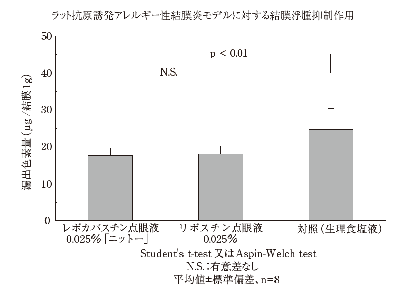 ラット抗原誘発アレルギー性結膜炎モデルに対して、レボカバスチン点眼液0.025%「ニットー」及びリボスチン点眼液0.025%の結膜炎及び結膜浮腫抑制作用をそれぞれ比較した。両剤及び対照(生理食塩液)を初回感作翌日より両眼に25μLずつ1日2回(午前、午後)、7日間、計14回点眼投与した。最終日は抗原惹起20分前に投与し、その後の抗原惹起による結膜充血及び腫脹の状態を各測定時点で観察し、結膜炎スコアを付け、そのスコアを指標として結膜炎抑制作用を評価した。また、抗原惹起5分前にエバンスブルー含有生理食塩液を尾静脈内投与し、その後の抗原惹起による結膜からの漏出色素量を指標として結膜浮腫抑制作用を評価した。その結果、両剤ともに対照に対し、結膜炎スコア及び結膜1g当たりの漏出色素量に有意な差が認められ、両剤間では有意な差は認められず、両剤の生物学的同等性が確認された15) 。