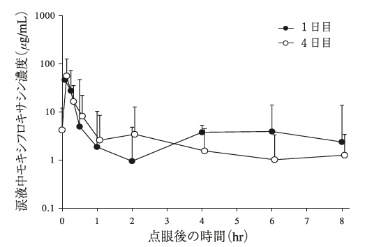 健康成人(外国人n=27)に0.5%モキシフロキサシン点眼液を両眼に1回1滴、1日3回、3日間及び4日目1回1滴、1日1回点眼したときの1日目初回点眼後と4日目最終点眼後の涙液中モキシフロキサシン濃度推移は図1のとおりであった。投与8時間後のモキシフロキサシンの平均涙液中濃度は1日目初回点眼後が2.35μg/mL、4日目最終点眼後が1.25μg/mLであった3)。