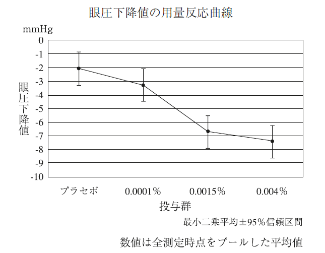 原発開放隅角緑内障又は高眼圧症患者を対象としたトラボプロスト点眼液(ベンザルコニウム塩化物含有製剤)の二重盲検による第Ⅱ相用量反応試験(投与期間:14日間)において、眼圧下降値は、プラセボ群2.1mmHg(22例)、0.0001%群3.3mmHg(21例)、0.0015%群6.7mmHg(22例)、0.004%群7.4mmHg(21例)であり、有意な用量反応性が認められた。