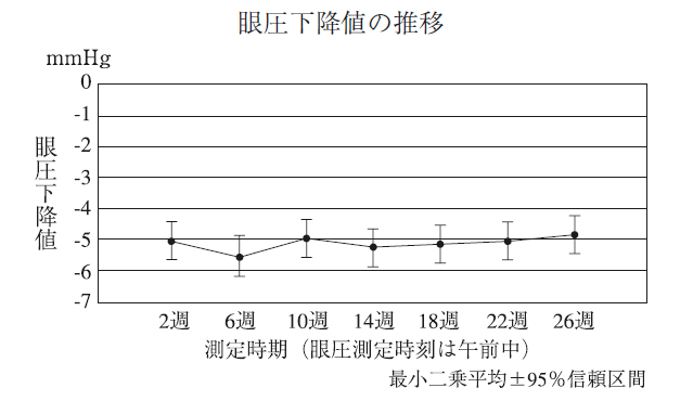 正常眼圧緑内障を含む原発開放隅角緑内障又は高眼圧症患者を対象としたトラボプロスト0.004%点眼液(ベンザルコニウム塩化物含有製剤)の第Ⅲ相長期投与試験(投与期間:6ヵ月)において、 トラボプロスト0.004%群(70例)の眼圧下降値は4.8~5.5mmHgであり、6ヵ月間を通して安定した眼圧下降効果が認められた。