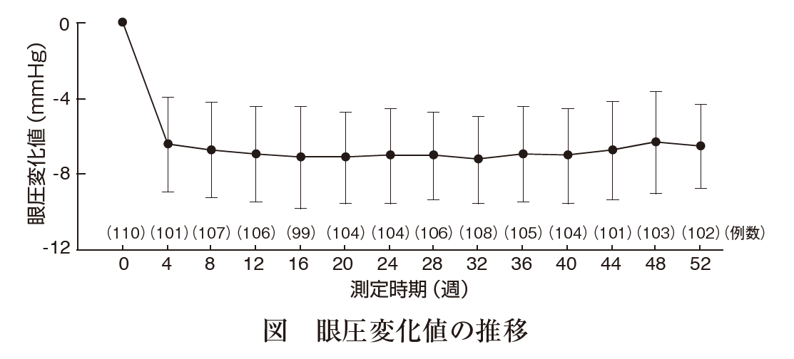 原発開放隅角緑内障(広義)又は高眼圧症患者を対象に、0.03%ビマトプロスト点眼液を両眼に1回1滴、1日1回最長52週間点眼した長期投与試験を実施した。その結果、眼圧変化値の推移は図のとおりであり、52週間を通して-7.2~-6.3mmHgの範囲で推移し、0.03%ビマトプロスト点眼液の安定した眼圧下降効果が示された12) 。