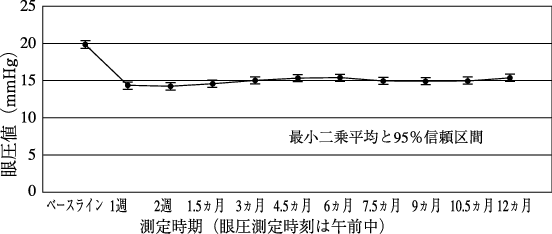 正常眼圧緑内障を含む原発開放隅角緑内障又は高眼圧症患者140例を対象とした第Ⅲ相長期投与試験(投与期間:12ヵ月)において、トラボプロスト0.004%/チモロール0.5%配合点眼液(ベンザルコニウム塩化物含有製剤)群の平均眼圧下降値は-5.6~-4.5mmHgであり、12ヵ月間を通して安定した眼圧下降効果が認められた。