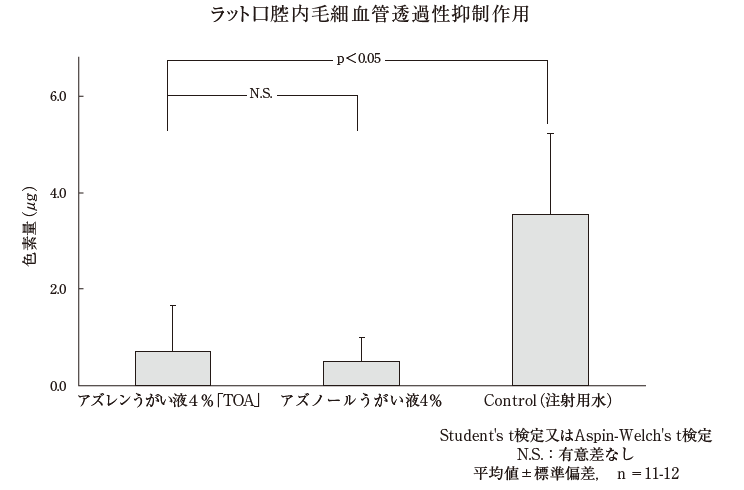 ラット口腔内毛細血管透過性モデルに対して、アズレンうがい液4%「TOA」とアズノールうがい液4%の20倍希釈液を口腔内に注入後、注入した色素の口腔内毛細血管からの漏出色素量を指標にして消炎作用を比較した。その結果、両剤ともControl(注射用水)に対して有意な色素量の減少が認められ、両剤間では有意な差は認められず、両剤の生物学的同等性が確認された5) 。