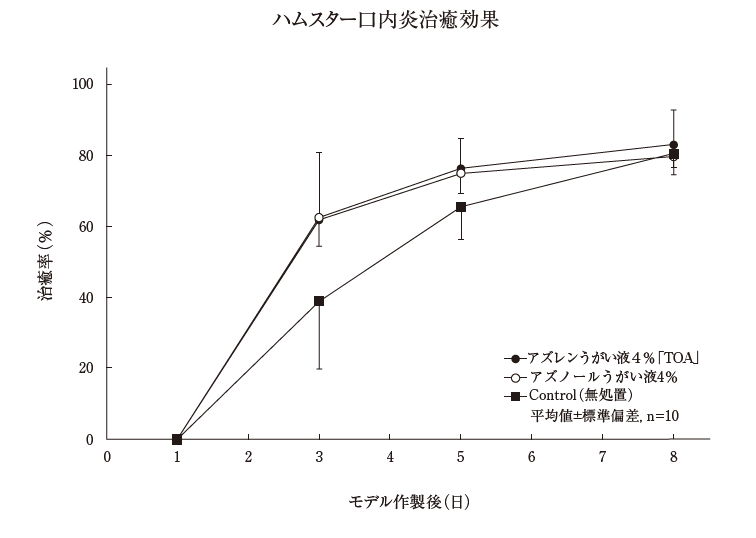 ハムスター口内炎モデルに対して、アズレンうがい液4%「TOA」とアズノールうがい液4%の800倍希釈液を頬嚢内に注入投与(含嗽)し、創傷部面積を指標として治癒率を比較した。その結果、両剤ともControl(無処置)に対して治癒率に有意な差が認められ、両剤間では有意な差は認められず、両剤の生物学的同等性が確認された5) 。