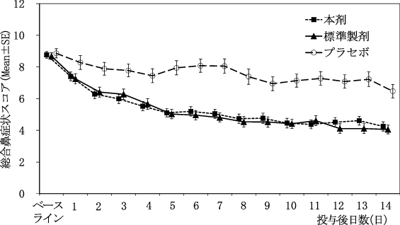 季節性アレルギー性鼻炎患者(成人)を対象とした治療学的同等性試験において、本剤、標準製剤又はプラセボを各鼻腔に2噴霧ずつ1日1回(モメタゾンフランカルボン酸エステルとして1日200μg)2週間投与した。主要評価項目である総合鼻症状スコア(くしゃみ発作、鼻汁、鼻閉、鼻内そう痒感)の期間平均変化量注4)を同等性の指標とし、得られた値の平均値の差の95%信頼区間を算出した結果、治療学的同等限界(⊿=±1.13)の範囲内であり、両剤の治療学的同等性が確認された。2)