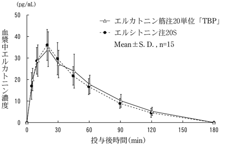 エルカトニン筋注20単位「TBP」とエルシトニン注20Sを、クロスオーバー法によりそれぞれ1アンプル(20エルカトニン単位)を健康成人男子に、絶食単回筋肉内投与して血漿中未変化体を測定し、得られた薬物動態パラメータ(AUC、Cmax)について90%信頼区間法にて統計解析を行った結果、log(0.8)~log(1.25)の範囲内であり、両剤の生物学的同等性が確認された3)。