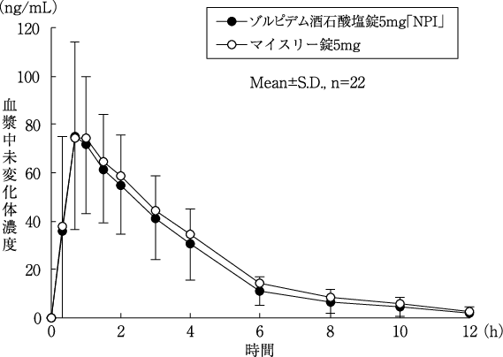 ゾルピデム酒石酸塩錠5mg「NPI」とマイスリー錠5mgを、クロスオーバー法によりそれぞれ1錠(ゾルピデム酒石酸塩として5mg)健康成人男性に絶食単回経口投与して血漿中未変化体濃度を測定し、得られた薬物動態パラメータ(AUC、Cmax)について90%信頼区間法にて統計解析を行った結果、log(0.80)~log(1.25)の範囲内であり、両剤の生物学的同等性が確認された2)。