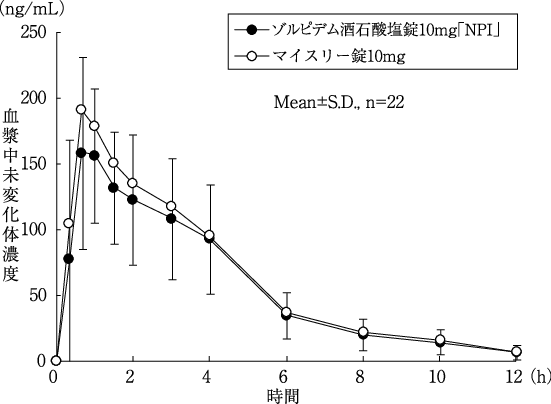 ゾルピデム酒石酸塩錠10mg「NPI」とマイスリー錠10mgを、クロスオーバー法によりそれぞれ1錠(ゾルピデム酒石酸塩として10mg)健康成人男性に絶食単回経口投与して血漿中未変化体濃度を測定し、得られた薬物動態パラメータ(AUC、Cmax)について90%信頼区間法にて統計解析を行った結果、log(0.80)~log(1.25)の範囲内であり、両剤の生物学的同等性が確認された2)。